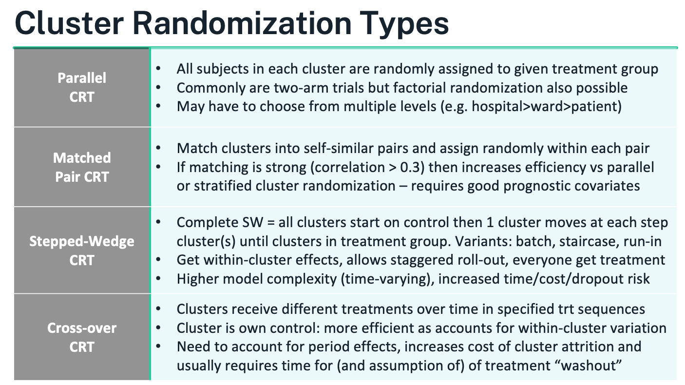 Principle. The randomization scheme should follow the trial’s objective, endpoint behavior, and what design/analysis assumptions you can credibly defend under real operational constraints. A useful rule of thumb: pick the cluster design that is the closest feasible analog to the individually randomized design you would otherwise run.