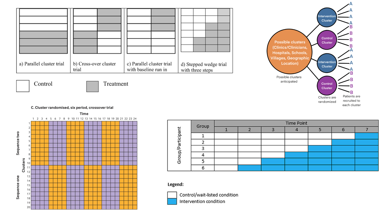 Donner, A., & Klar, N., 1996. Statistical considerations in the design and analysis of community intervention trials. Journal of Clinical Epidemiology, 49(4), 435–439. Hemming, K., Copas, A., Forbes, A. and Kasza, J., 2024. What type of cluster randomized trial for which setting?. Journal of epidemiology and population health, 72(1), p.202195. Hemming, K., Eldridge, S., Forbes, G., Weijer, C. and Taljaard, M., 2017. How to design efficient cluster randomised trials. bmj, 358. Watson, S.I., Girling, A. and Hemming, K., 2023. Optimal study designs for cluster randomised trials: An overview of methods and results. Statistical Methods in Medical Research, 32(11), pp.2135-2157.