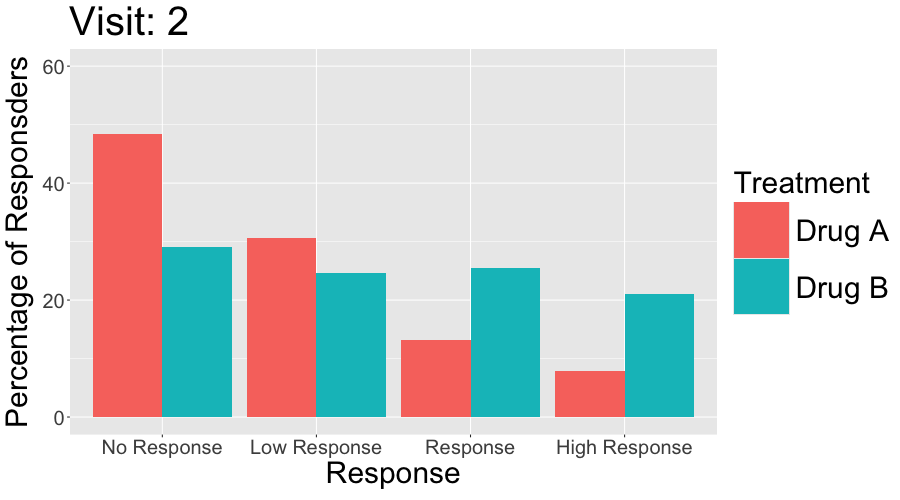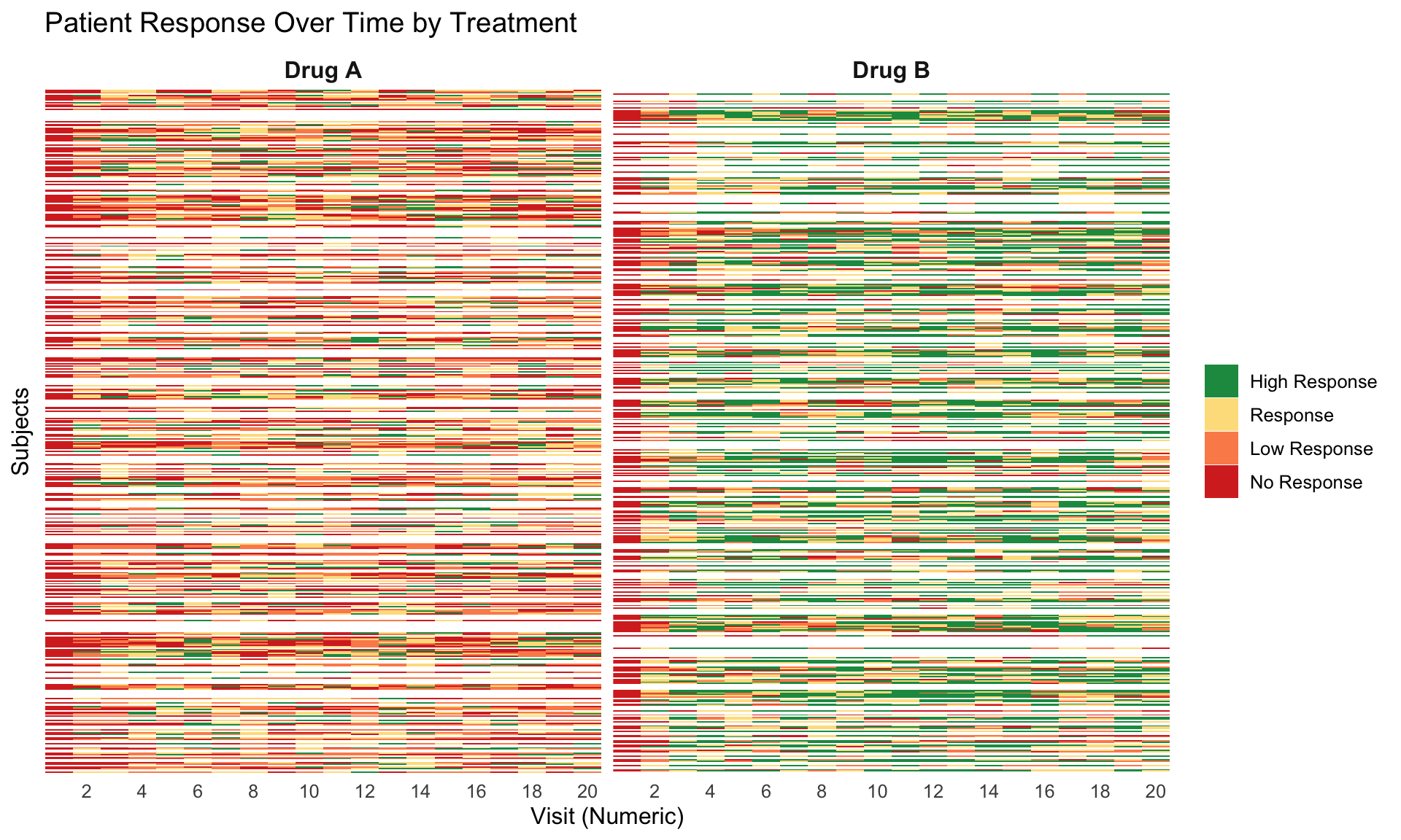 In this month’s dataset, DLQI has been administered in a phase 3 clinical trial to patients with psoriasis. There are two imbalanced treatment groups, with 150 patients randomised to Placebo (Treatment A) and 450 to the active treatment (Treatment B). DLQI responses are recorded at Baseline and Week 16 (although some DLQI assessment is missing at Week 16), allowing the treatment effect in terms of Quality of Life to be assessed. The Psoriasis Area and Severity Index (PASI) is also recorded at baseline.