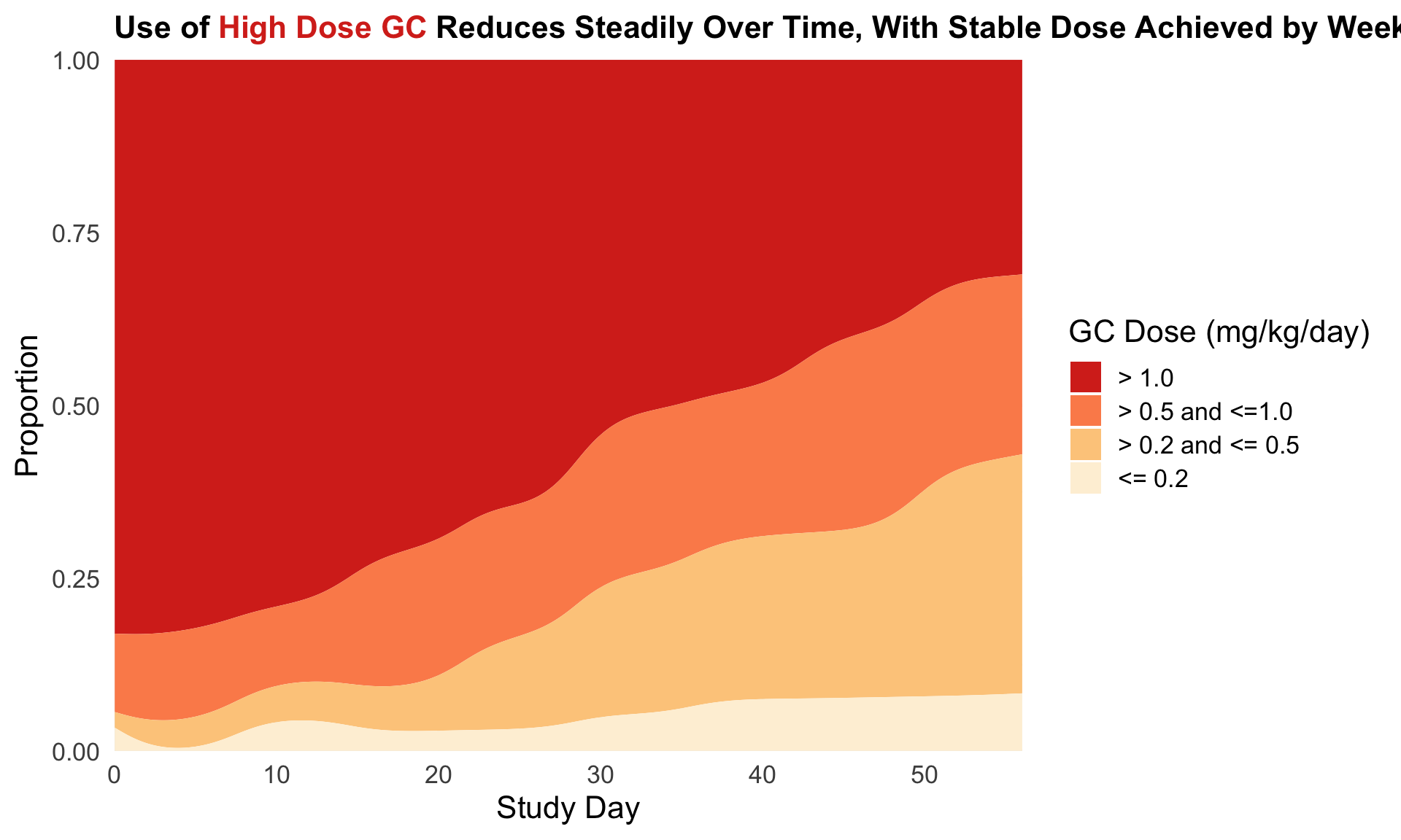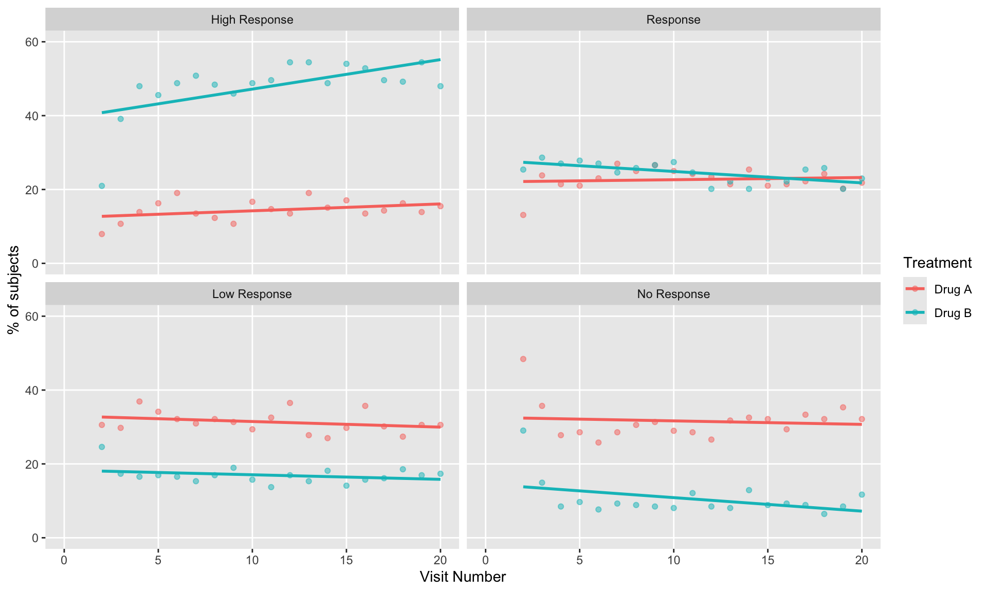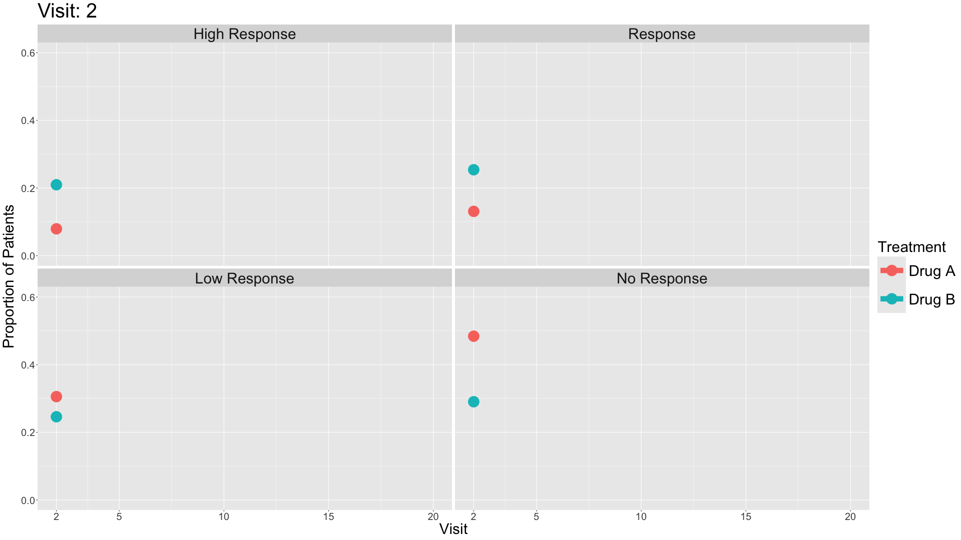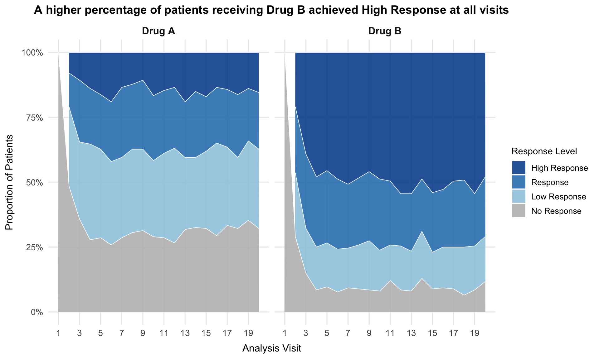 The dot plot displayed here is a great way to quickly see the effect of treatment on the different DLQI items. For each item and each group, we see mean scores for both Baseline and Week 16, which are coloured differently and consistently to allow patterns to be quickly and easily identified. Whilst it is not something commonly seen, the position of the legend in the middle of the page works really nicely and can be quickly referenced for each plot.