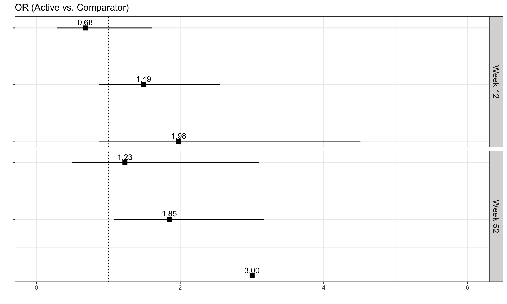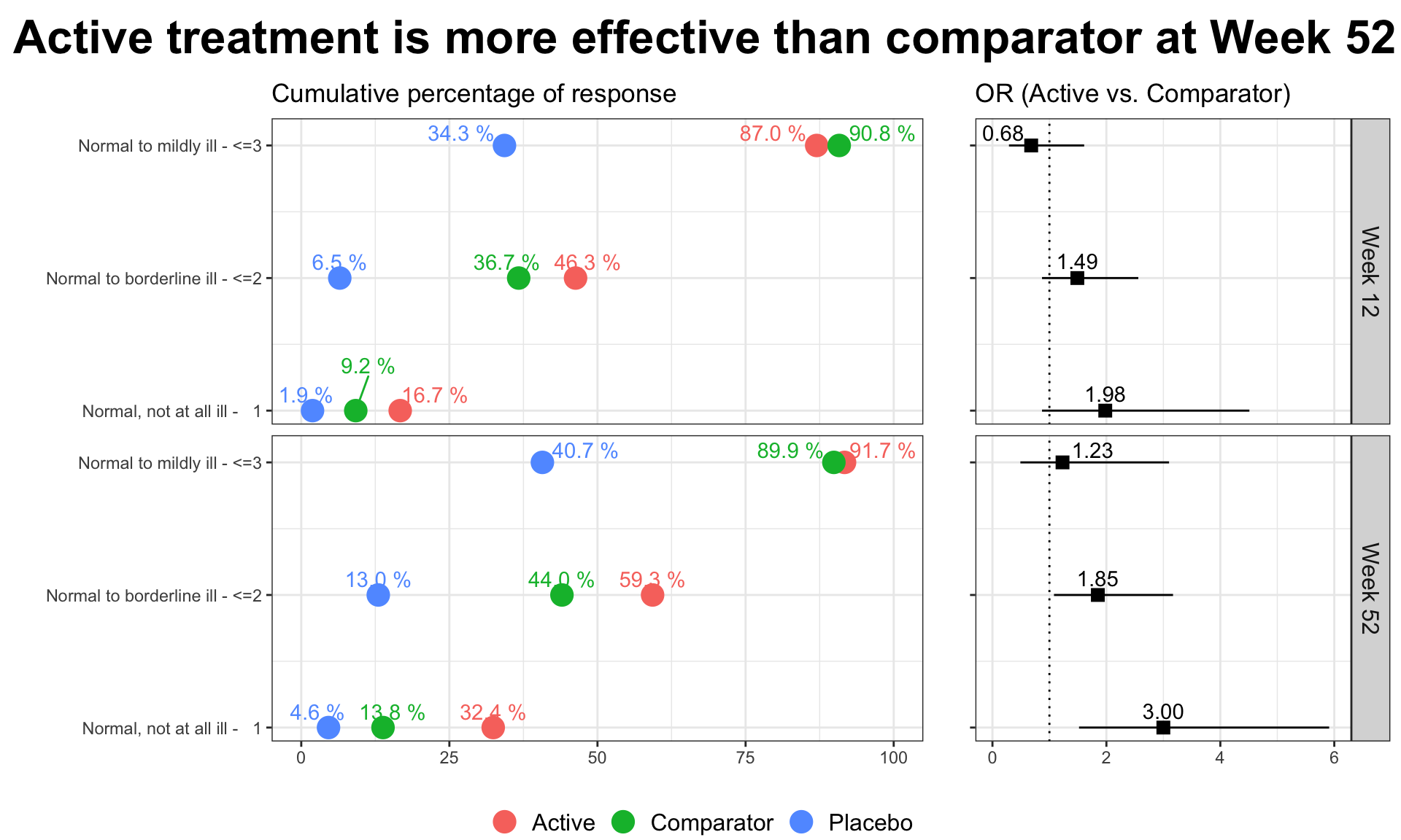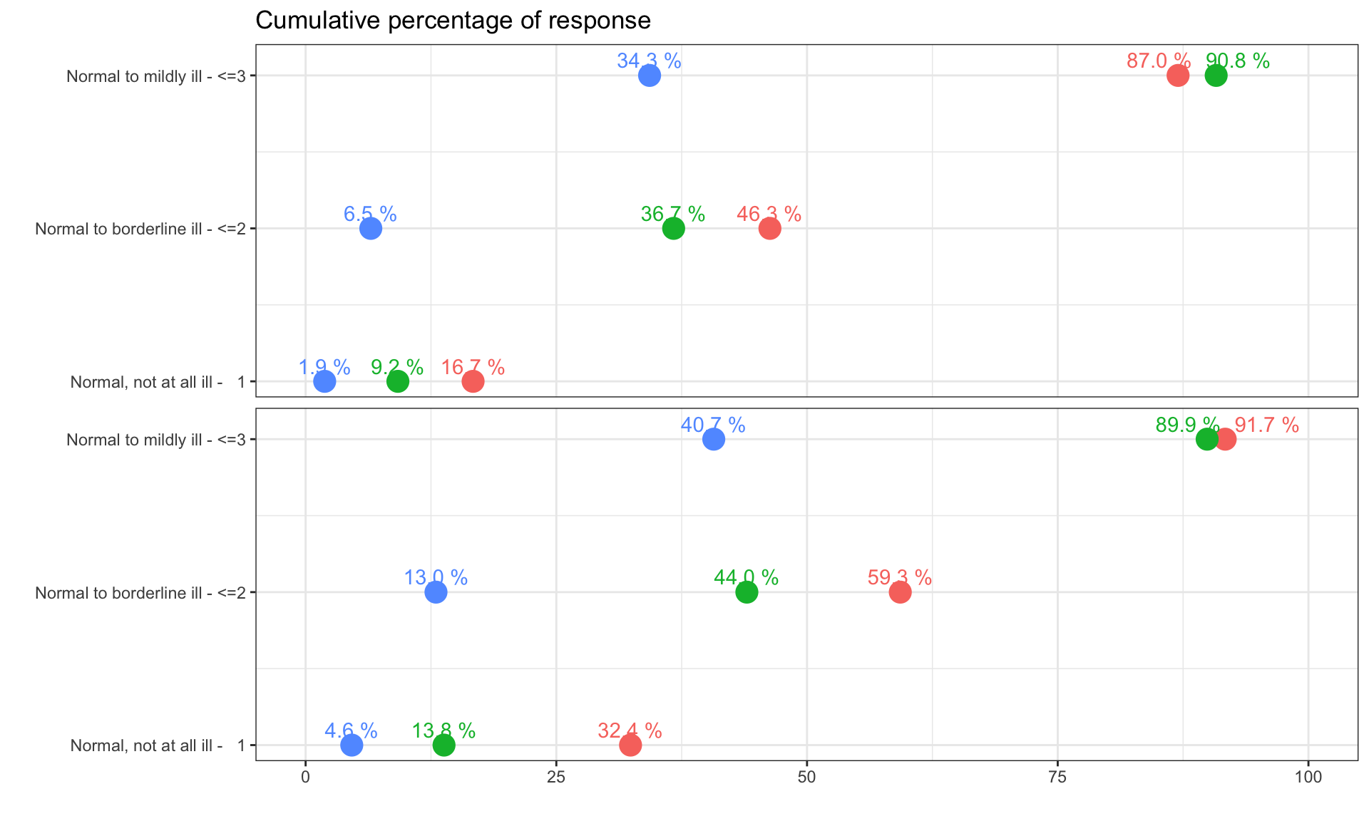 Unlike in the previous example, here the items are sorted in the order they appear on the questionnaire. Alternative ways to sort the items could be considered to highlight those which are most interesting, such as sorting by baseline means or by effect size. There are also a few tweaks to the horizontal axes which the group felt should be made. Firstly, it would be better to start from zero on the first dot plot, otherwise the effect size appears to be exaggerated. Further, the horizontal axes and spacing between labels should be made consistent for the two treatment groups, allowing for direct comparison between the two figures.