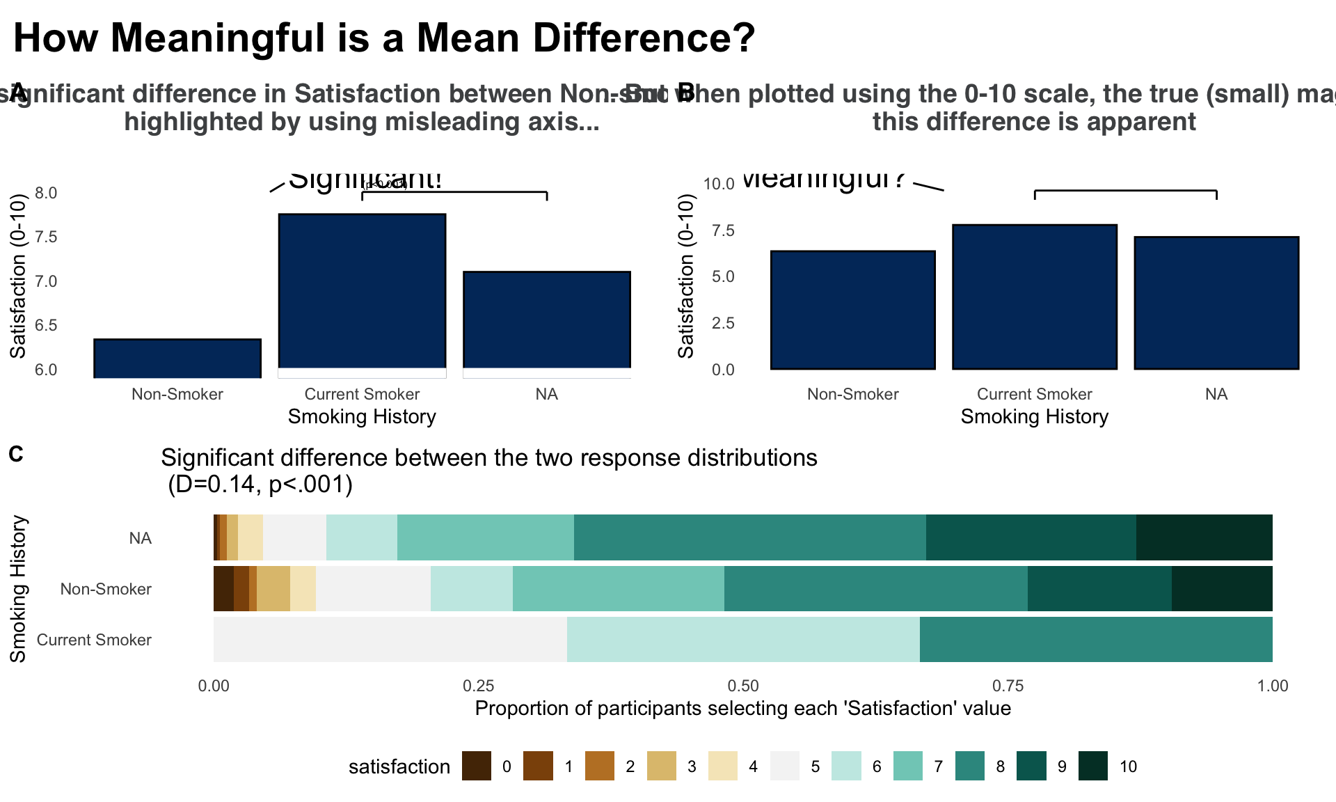 ggtitle("A statistically significant difference in Satisfaction between Non-smokers and Smokers \n highlighted by using misleading axis... \n") +