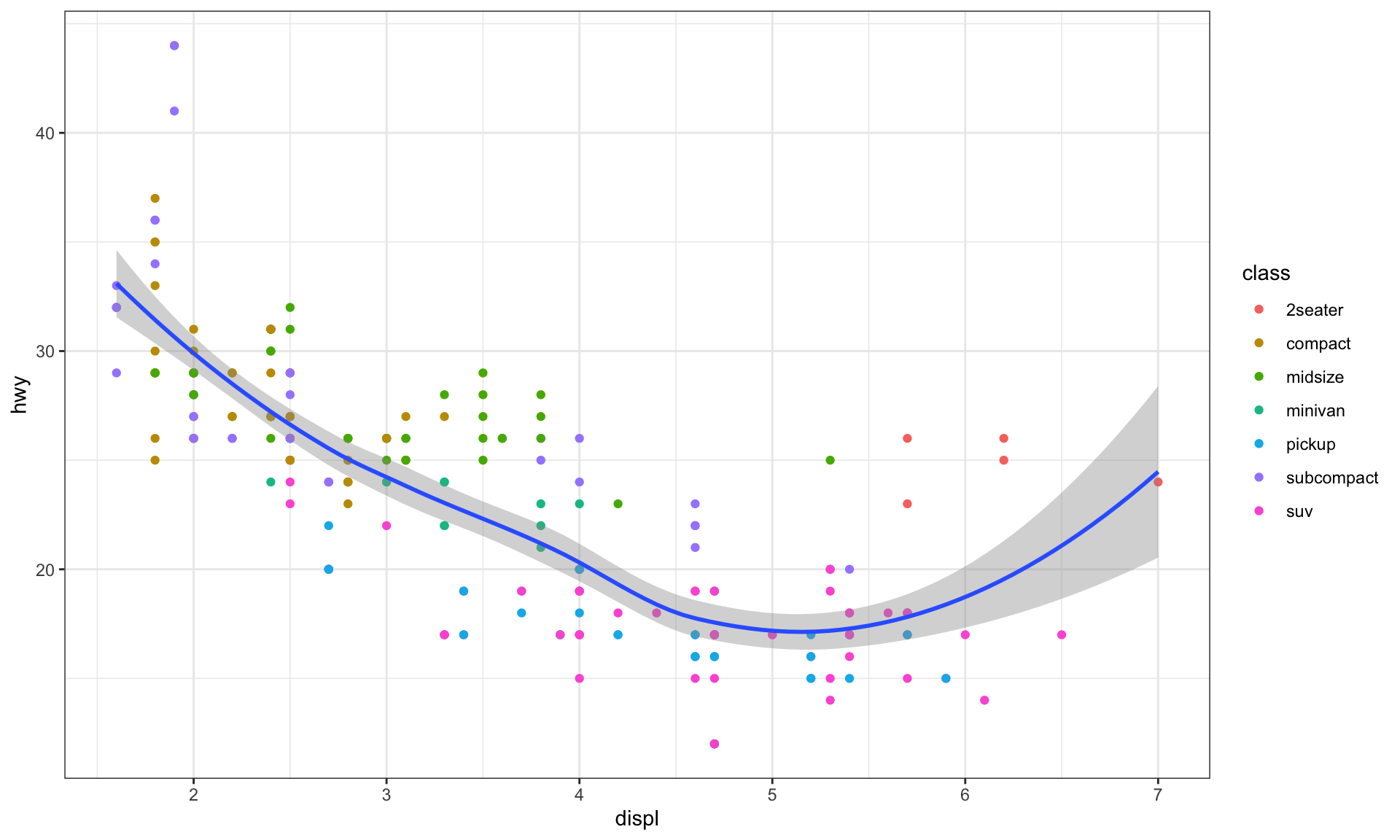 ggplot(data = mpg, mapping = aes(x = displ, y = hwy)) +