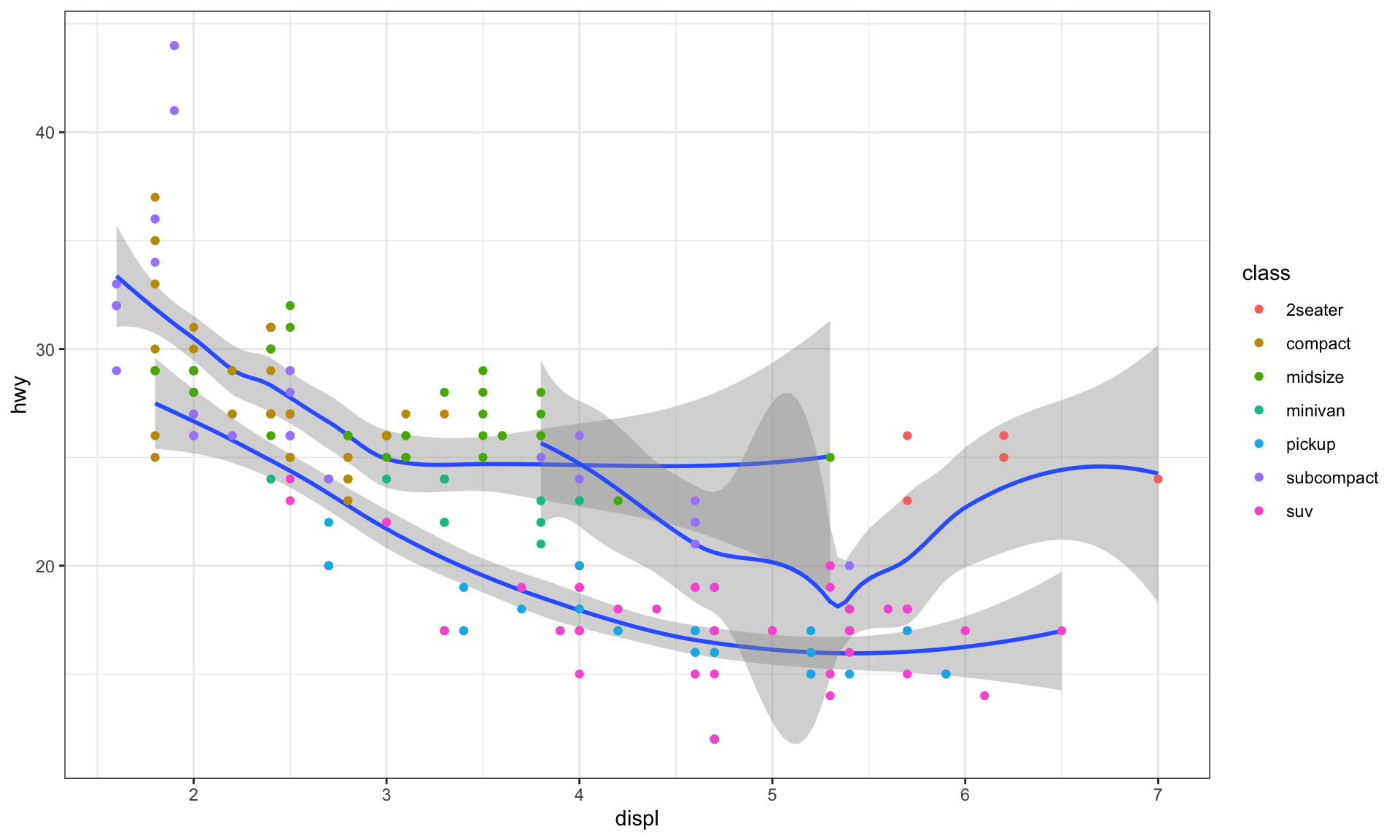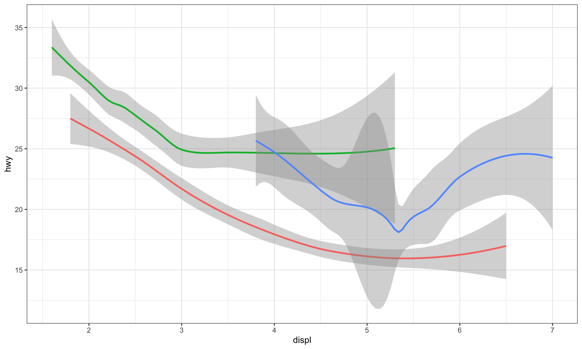 geom_smooth(mapping = aes(x = displ, y = hwy, group = drv)) +