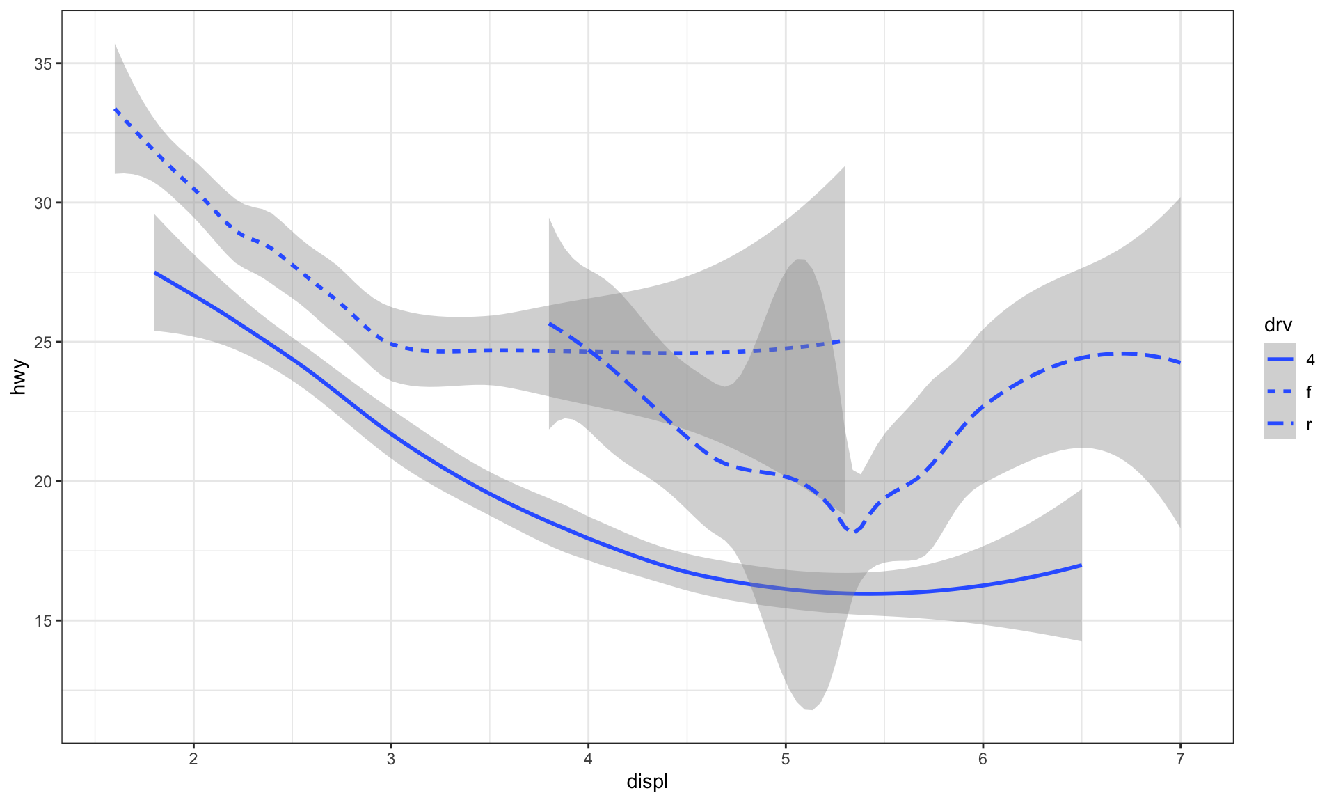 geom_smooth(mapping = aes(x = displ, y = hwy, linetype = drv))