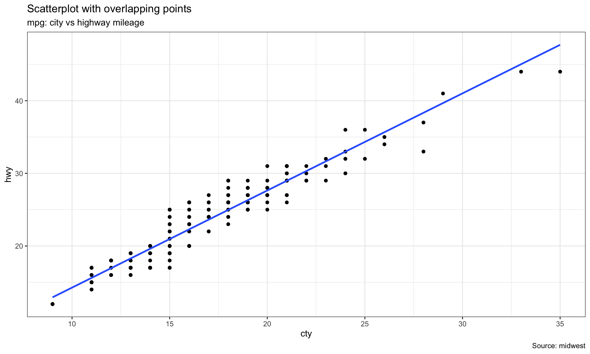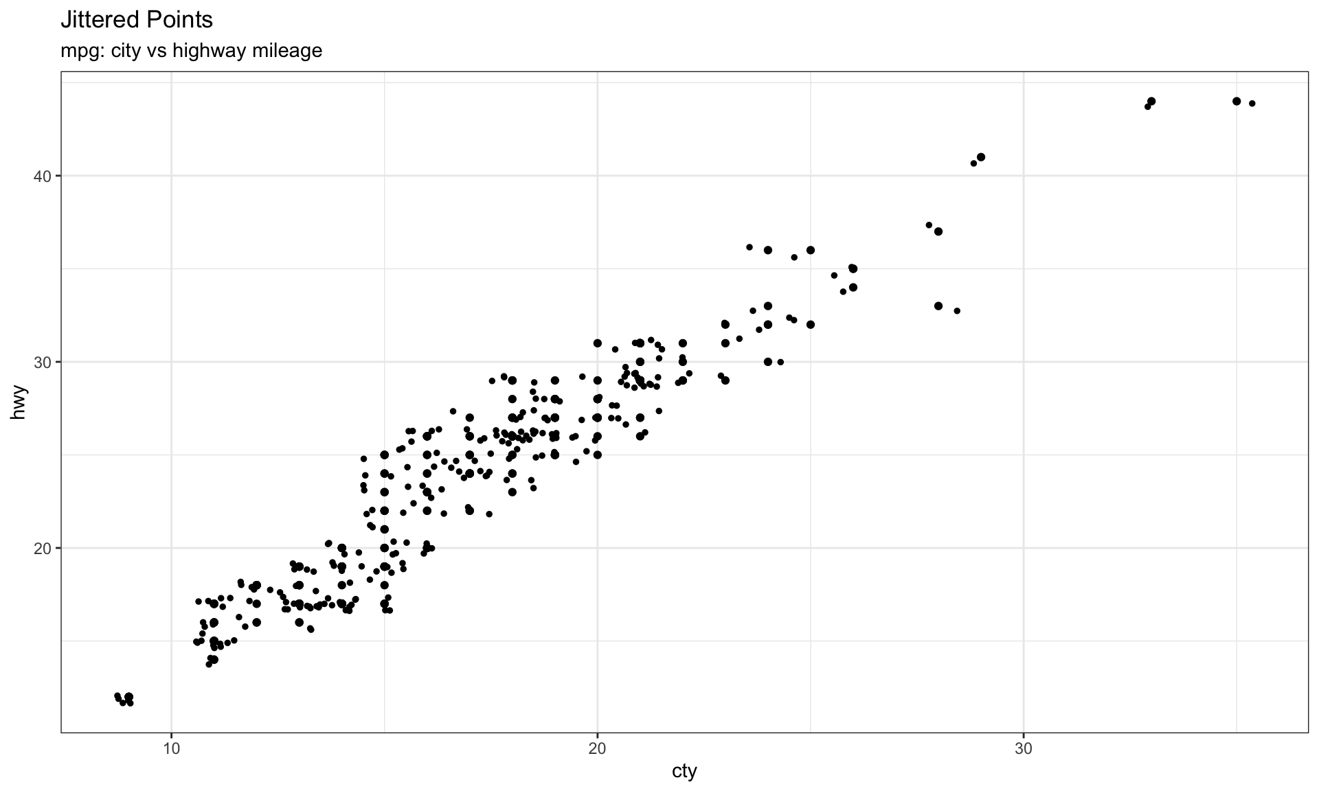 # The raw dataset has 234 observations, but shown in figure fewer, because some points lay together, the jitter plot could be used in this case by applying jitter_geom