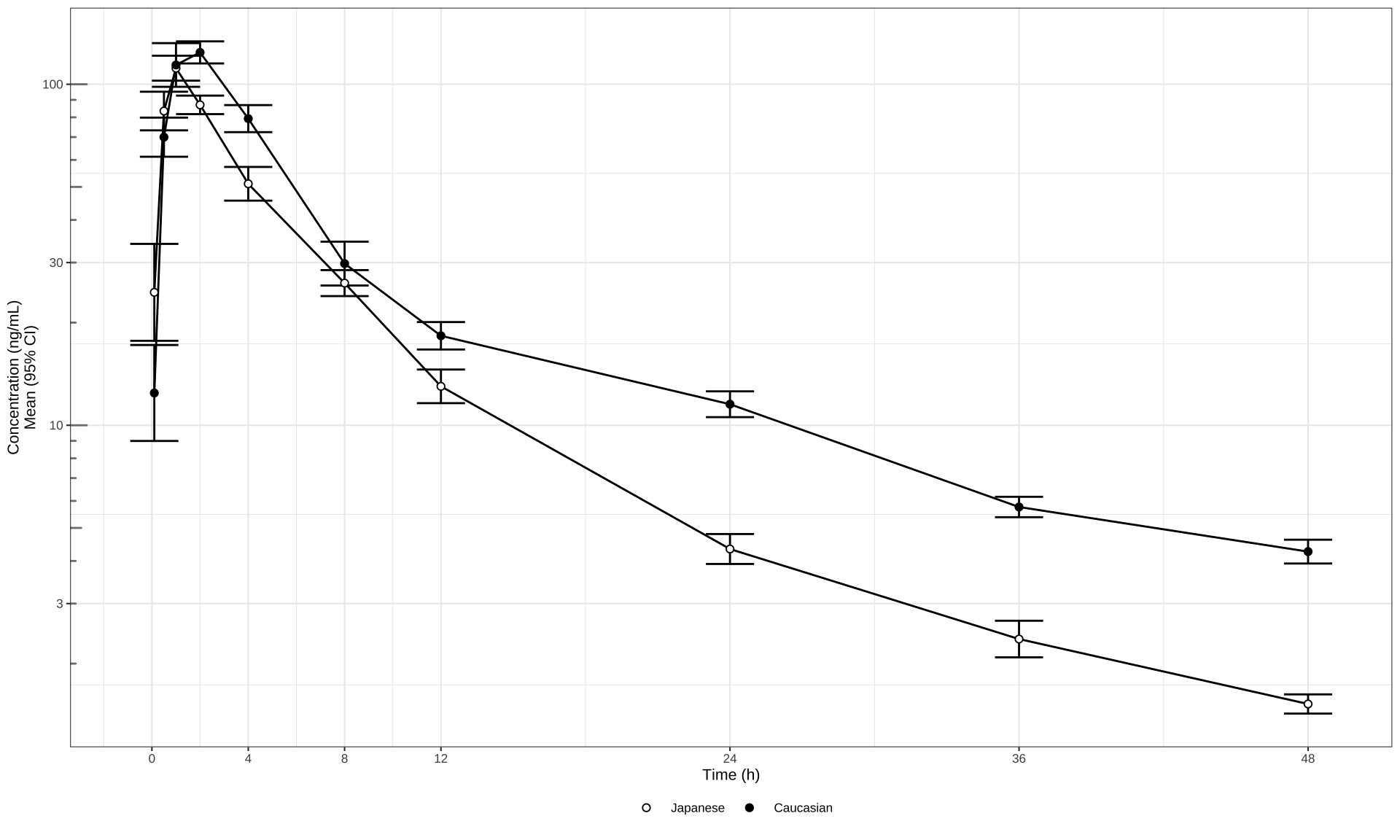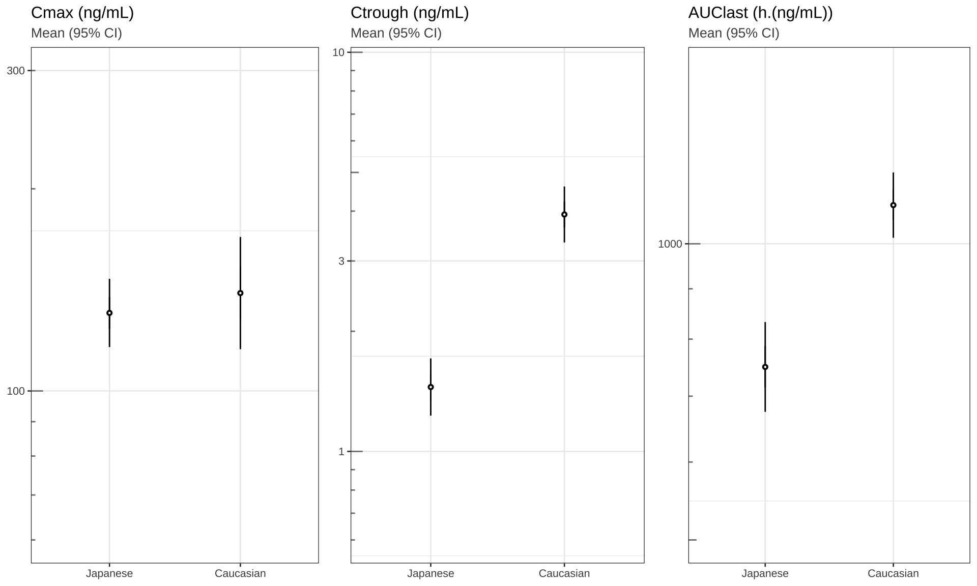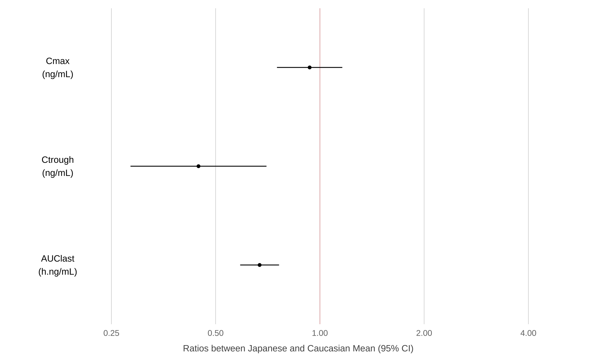 ylab("Ratios between Japanese and Caucasian Mean (95% CI)") +